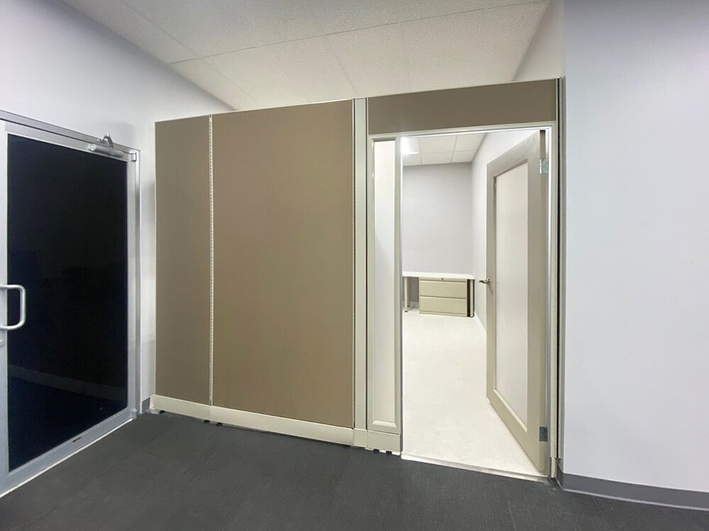 The first space is an enclosed office where our office space designers utilized three existing walls and closed off the space with modular office walls, a door with glass insert and a glass sidelight.