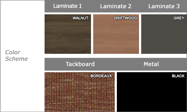 This industrial office setup comes standard in the following finishes: the storage tower with door and credenza cabinet with drawer in a Walnut laminate finish with a contrasting Grey laminate finish for the wall hutch storage, and the fabric tackboard in a rich Bordeax fabric.